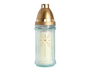 Skleněná hřbitovní lampa se zlatým plastovým víčkem.