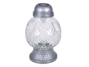 Skleněná hřbitovní lucerna ve tvaru baňky o výšce 17 cm.