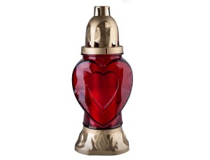Červená skleněná hřbitovní lampa ve tvaru srdce s černým plastovým kuželovitým víčkem.