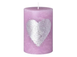Rustikální svíčka válec v sv. fialové barvě + srdíčko lak 70x100 mm