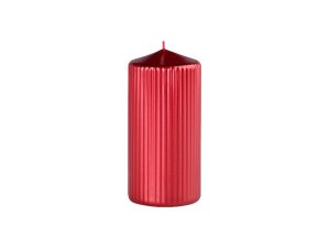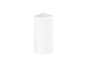 Matná svíčka ve tvaru válce, zdobená šikmými pruhy po celém obvodu.