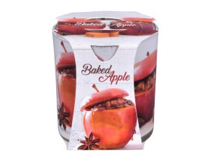 Vonná svíčka ve skle potažená fólií s dekorativním potiskem pečeného jablka, určená jako dekorace do bytu nebo jako dárek.