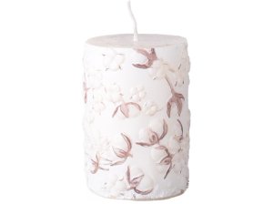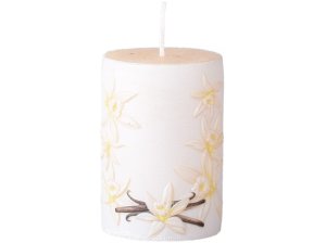 Bílá svíčka ve tvaru válce o průměru 7 cm a výšce 8 cm.