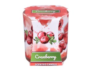 Vonná svíčka ve skle potažená fólií s dekorativním potiskem brusinek, určená jako dekorace do bytu nebo jako dárek.