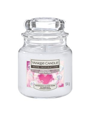 Vonná svíčka s jiskřivou vůní bublinkové lázně s tóny bílé šalvěje, sladké vody a čistého pižma.