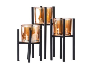 Sada tří černých kovovo-skleněných svícnů – elegantní a praktická dekorace.