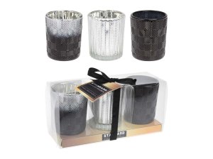 Sada tří skleněných svícnů – kombinace černé, stříbrné a šedé.