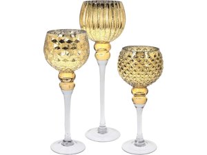 Sada tří zlatých skleněných svícnů na nožičce – elegantní a slavnostní dekorace.