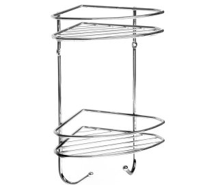 Kvalitní dvoupatrová rohová koupelnová polička vyrobená z chromovaného drátu.