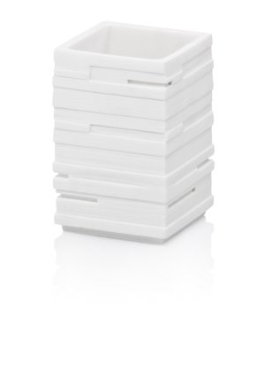 Bílý kelímek na zubní kartáčky ze série Cube od kela s matným vzhledem. Čtvercový základní tvar a solidně působící vzhled v kombinaci s bílou barvou dodávají hrnku osobitý vzhled.