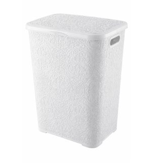 Koš na prádlo, objem 56 litrů, větrání díky drobným otvorům, madla pro pohodlné přenášení, víko s úchytkou pro zavěšení víka za okraj koše, 70% recyklovaný plast.