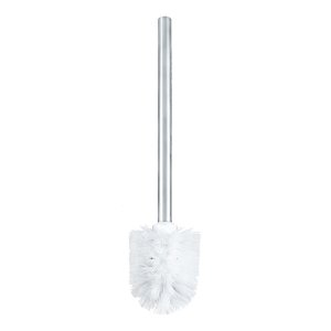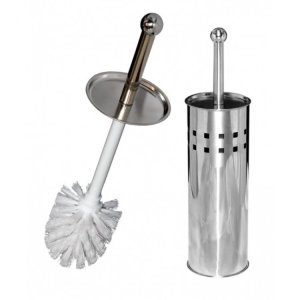 WC souprava na toaletu, štětka s kovovým držadlem v bílé plastové nádobě na kovovém stojánku.