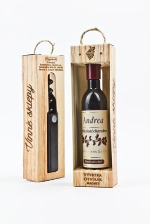 Vývrtka ve tvaru vinné lahve s originálním potiskem viněty je vhodným dárkem pro všechny milovníky vína.