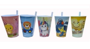 Kvalitní plastový pohárek 500ml (po horní okraj) s integrovaným brčkem a dětským dekorem.