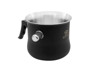 Nerezový mlékovar s dvojitou stěnou, píšťalkou a tvarovanou plastovou rukojetí.