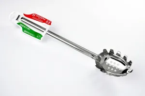 Kvalitní celonerezová naběračka na špagety se závěsným háčkem, délka 34.5 cm, šířka 6.5 cm, vhodná do myčky nádobí.