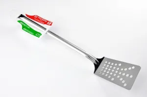Kvalitní celonerezová děrovaná obracečka s háčkem na zavěšení, délka 36.5 cm, šířka 7 cm, vhodná do myčky nádobí.