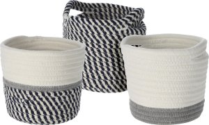 Košík kulatý pr. 13 cm, BA mix barev, mix dekorů. průměr: 13 cm výška: 13 cm materiál: bavlna mix barev: modrá / bílá, modrá / bílá / šedá, bílá / šedá Praktický košíček pro rozmanité použití.