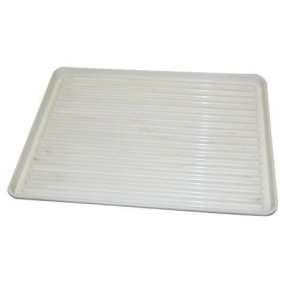 Tradiční odkapávač nádobí s žebrovaným dnem, bílá barva.