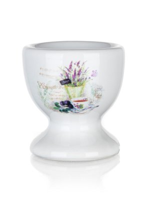 Kalíšek na vajíčko LAVENDER v bílé glazuře s dekorem levandule je vyrobený z keramiky.