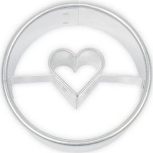 Vykrajovátko na cukroví ve tvaru kolečka průměrem 4 cm a srdíčkem uprostřed.