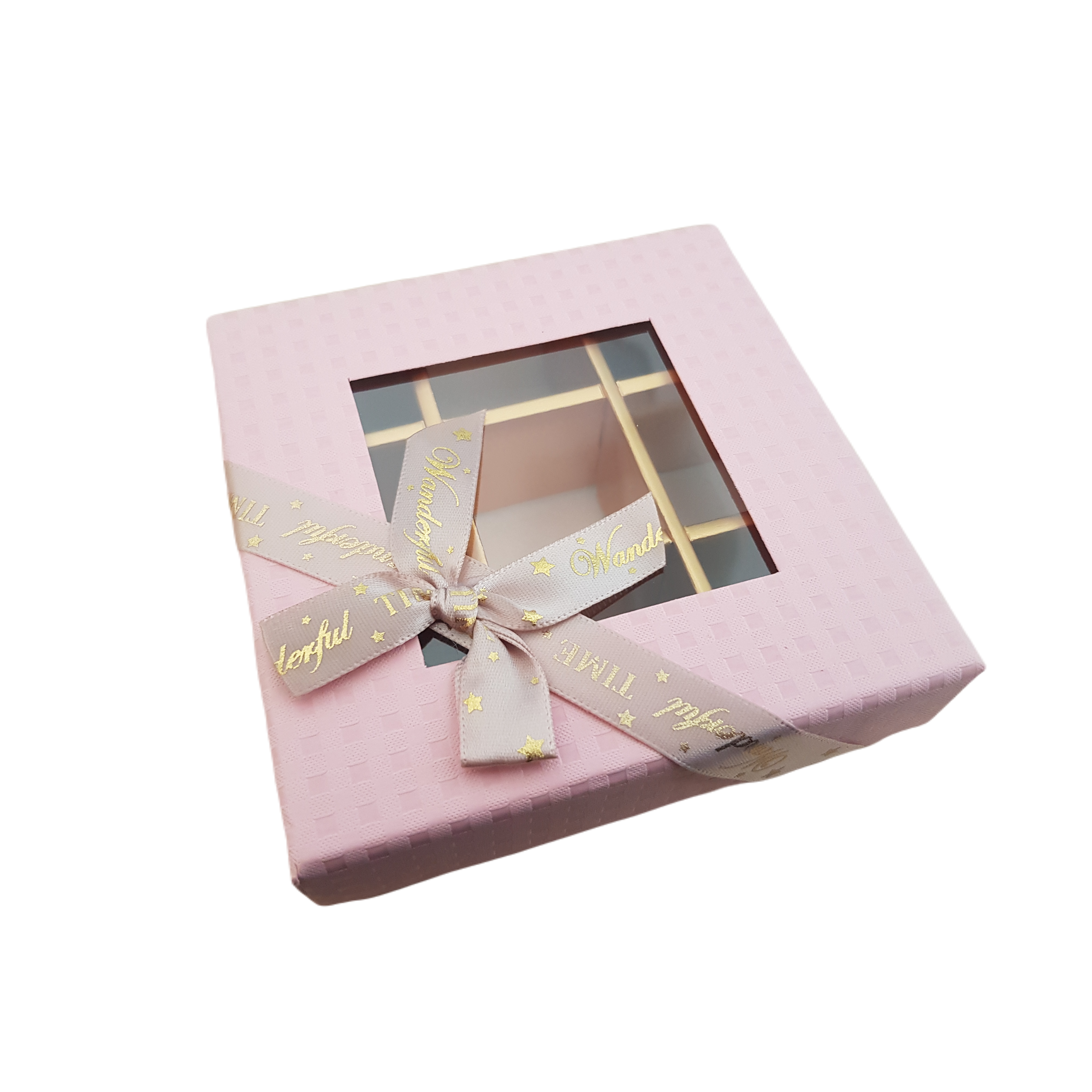 Papírová krabice s barevným potiskem na přenášení různých druhů cukrářského pečiva.