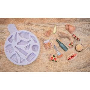 Silikonová forma na tvarování ozdob z cukrářských hmot nebo čokolády ve tvaru stavitele a nářadí.