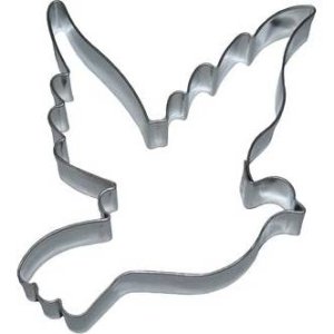 Vykrajovátko z pocínovaného plechu ve tvaru holubičky s rozměry 9,2 x 8 centimetru.