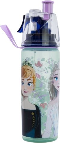 Dětská plastová láhev na vodu s náustkem a rozprašovacím tlačítkem.