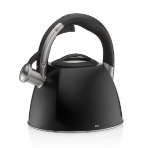 Moderní matný nerezový čajník s černými plastovými prvky, je opatřen odklápěcí píšťalkou, která ohlásí vařící se vodu .