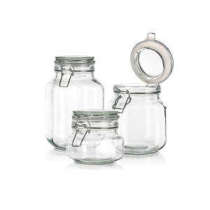 Sada skleněných hermetických dóz EREA 0,5 l + 1 l + 2 l se skleněným víčkem a kovovým zavíracím patentem, víčko je osazeno silikonovým těsněním, drátěný systém uzávěru není vhodný do myčky (není …