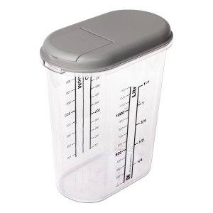 Transparentní krabice s měrkou vhodná na uchování potravin.