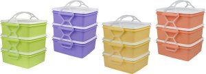4 díly: 4 x 1,0 l materiál: plast Box na ukládání a přepravu jídla, složený ze 4 dílů, které jsou navzájem propojené držadlem.