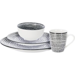 Jídelní sada 16 dílů – porcelánElegantní jídelní sada z kvalitního porcelánu s jemným červeným proužkem a černým tiskem z vnějšku.