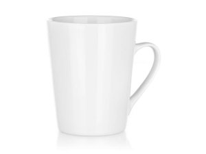 Bílý porcelánový hrnek objemu 320 ml bez dekoru s velkým uchem. 2.jakost, černé tečky nebo kazy na glazování.