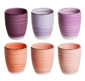Keramická kávová souprava MYKONOS - 6 x šálek na kávu.Tato sada obsahuje šest šálků o objemu 180 ml, všechny v barevném provedení v krásných kontrastních odstínech fialové a růžové barvy.