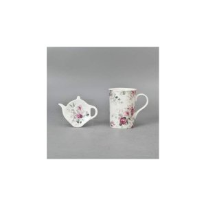 3dílná čajová sada ROSE, sada obsahuje: 1 x keramický hrnek o objemu 340 ml (výška 10,8 cm, horní průměr 7,6 cm, dolní průměr 6,5 cm), 1 x nerezové sítko, 1 x tácek pod sítko.