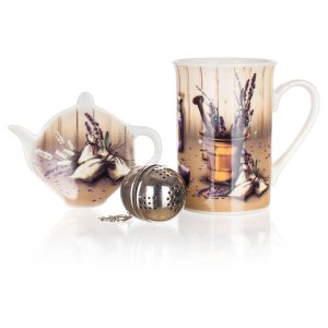 Hrnek 340 ml LAVENDER, tácek keramický, čajítko nerez, sada 3díl. čajová sada LAVENDER obsahuje: 1 x keramický hrnek o objemu 340 ml, výška 10,8 cm, průměr 7,6 cm 1 x nerezové sítko 1 x tácek pod …