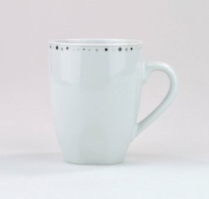 Hrnek z bílého porcelánu s dekorováním.