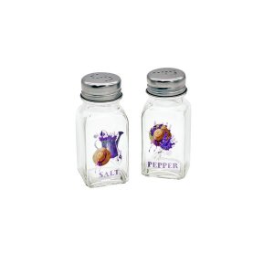 2 dílná dochucovací sada (slánka, pepřenka) o objemu nádobek 2 x 35 ml v kovovém stojanu.