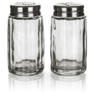 Slánka a pepřenka z čirého skla v nerezovém stojánku, 2 dílná dochucovací sada.