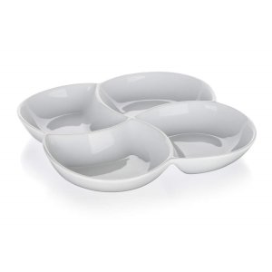 Servírovací porcelánová miska BIANCA dělená, v bílé barvě, ve tvaru čtyřlístku o rozměrech 26,5 x 26,5 cm a výšce 4,2 cm je vhodná pro servírování různých dipů, oříšků, chipsů, ovoce či zeleniny.