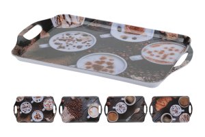 Podnos 38 x 23 cm, KÁVA, melamin, mix dekorů. rozměry: 38 x 23 cm materiál: melamin dekor KÁVA, mix 4 motivy Melaminový podnis s uchy slouží k přenášení či servírování nápojů, chlebíčků nebo derzertů.