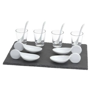 - servírovací set misek (kanapek) a skleniček se lžičkou na tácu pro nejrůznější příležitosti- materiál: porcelán / sklo / břidlice- barva: bílá / transparentní / šedá- perfektní pro servírování předkrmů, …