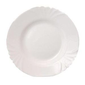 Mělký talířz tvrzeného skla bílé barvy, kvalitní sklo s vysokou pevností, lze používat do mikrovlnné trouby a do myčky na nádobí.