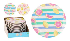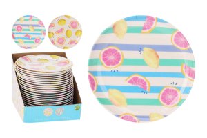 Talíř mělký 25 cm, melamin, ovocný motiv, mix. průměr: 25 cm materiál: melamin mix motivů: ovoce, ovoce a pruhy Plastový talíř je nerozbitný a lehce omyvatelný.