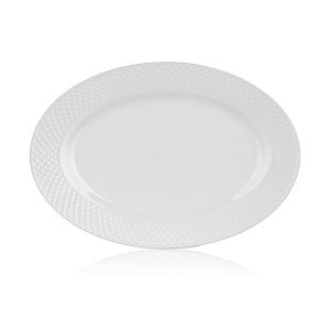 Oválný talíř Banquet Diamond Line v bílé barvě se zdobným reliéfem Vyrobeno z keramiky, rozměry 34,5 x 24,2 cm Lze použít do mikrovlnné trouby i do myčky na nádobí na běžné domácí použití