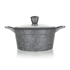 Hliníkový litý kastrol MARRONE o průměru 28 cm se skleněnou poklicí, která je opatřena knobem se silikonovým povrchem.