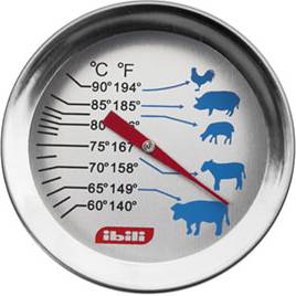 Teploměr s indikátorem ideálního propečení různých druhů masa.