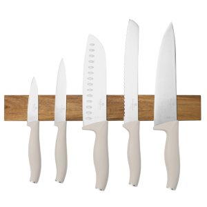 Sada 6 ks nožů s magnetickým závěsem z akáciového dřeva, Sahara Collection• Materiál: nerezová ocel 3cr13• Kuchařský nůž 20 cm• Nůž na chleba 20 cm• Nůž Santoku 17,5 cm• Pracovní nůž 12,5 cm• Nůž na …